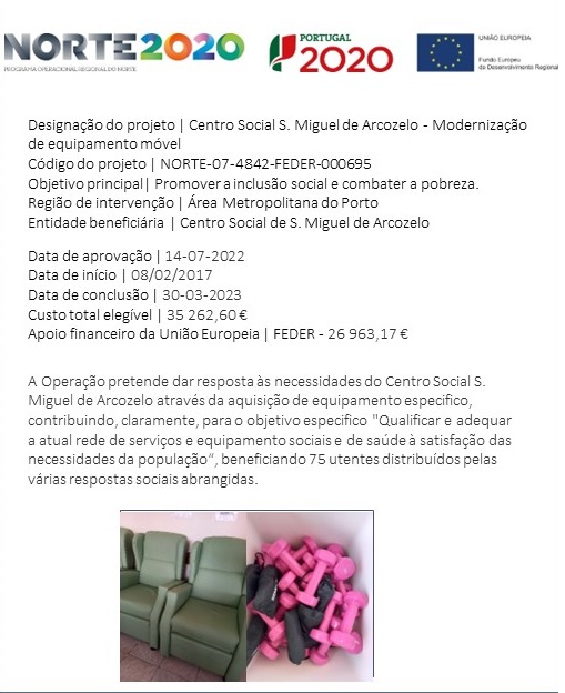 O Centro Social de S. Miguel é uma IPSS (Instituição Particular de Solidariedade Social) destinada a apoiar a fase mais madura da vida, a chamada 3ª Idade. Para tal, promove a ajuda possível nas suas quatro respostas sociais: Centro de Convívio, Centro de Dia; Apoio Domiciliário e Estrutura Residencial Para Pessoa Idosa. Esta Instituição desenvolve uma intensa atividade, por forma a corresponder às necessidades de alimentação, higiene, animação ocupacional, ginástica, turismo, etc, e uma vivência digna em salutar ambiente de alegria e paz.